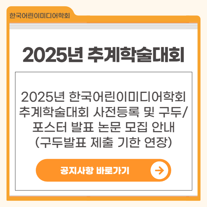 2025년 한국어린이미디어학회 추계학술대회 사전등록 및 구두/포스터 발표 논문 모집 안내(제출 기한 연장)