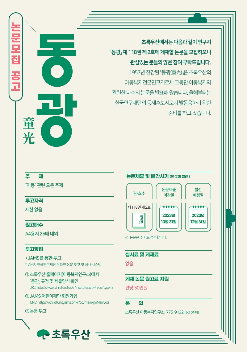 저희 재단은 올해부터 「동광」이 한국연구재단의 등재후보지로서 발돋움할 수 있도록 준비를 시작하였습니다. 「동광」의 학술지 등재 목적은 동시대 아동복지 이슈가 보다 많이 소통되도록 하기 위함이며, 현장을 기반으로 한 저희 재단의 특성이 기존 학술지들에 더해 국내 아동복지 발전에 기여할 수 있으리라는 기대에서 비롯되었습니다.