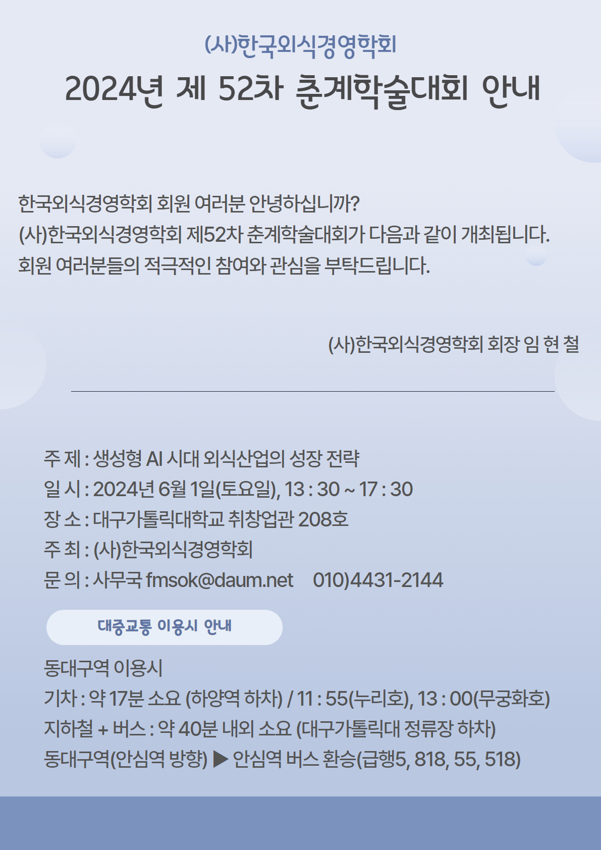 (사)한국외식경영학회 제52차 춘계학술대회가 다음과 같이 개최됩니다.