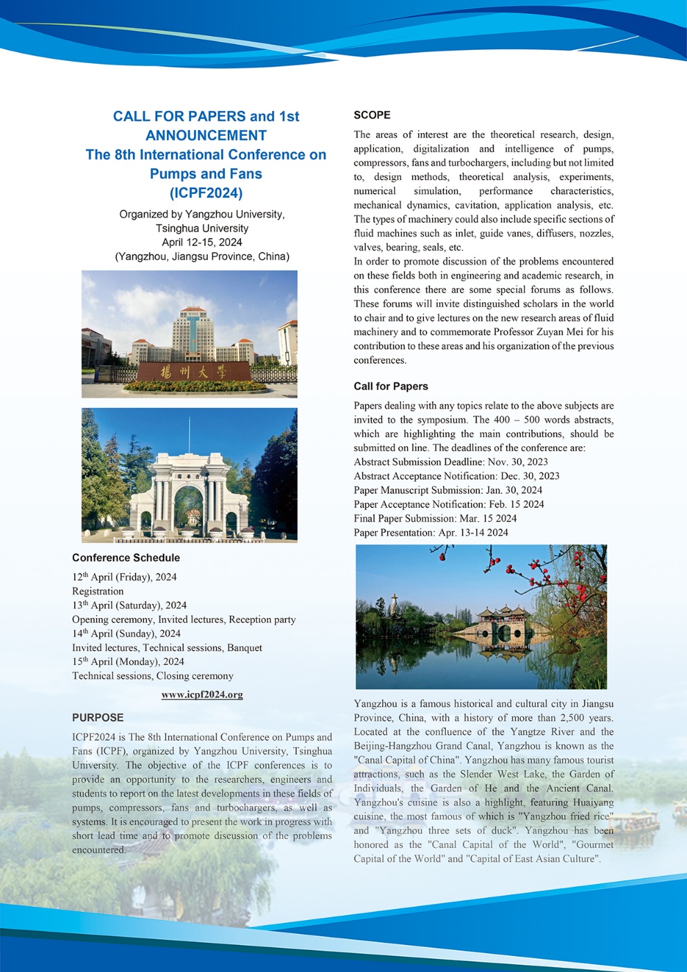 ICPF2024 (The 8th International Conference on Pumps and Fans)이 2024년 4월 중국에서 개최됩니다.