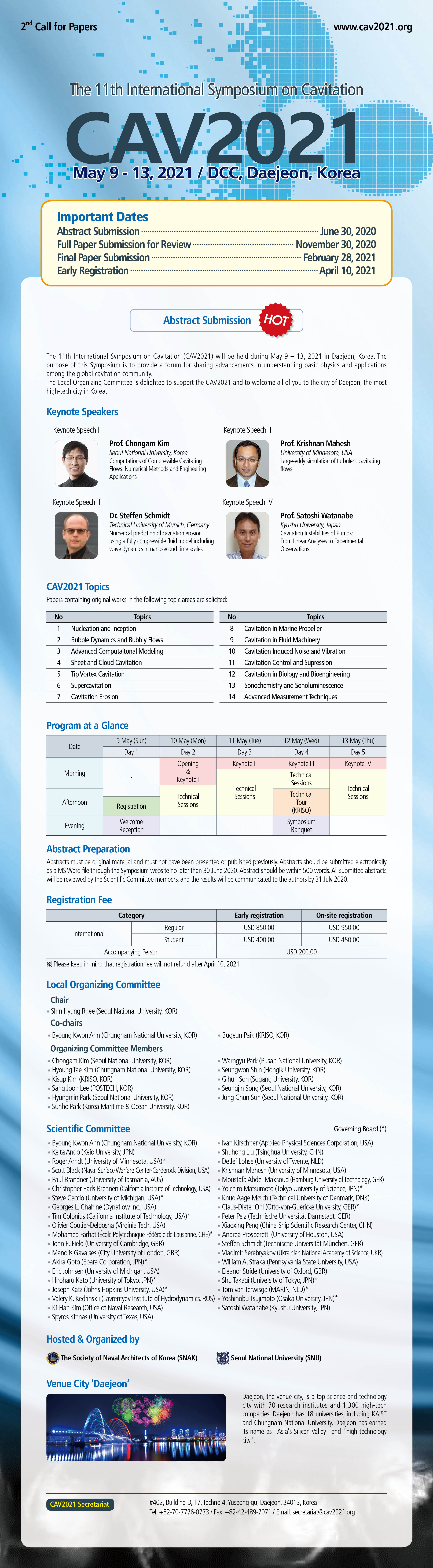 2021세계공동현상심포지움 (11th International Symposium on Cavitation, 이하 CAV2021)은 대한조선학회가 주최하고 CAV2021 조직위원회(대회장 서울대학교 이신형 교수, 공동 조직위원자 충남대학교 안병권 교수, 선박해양플랜트연구소 백부근 박사)가 주관하며, 대한민국 국토와 과학의 중심도시 대전광역시의 DCC에서 2021년 5월 9일부터 13일 간 개최 될 예정임을 안내드립니다.