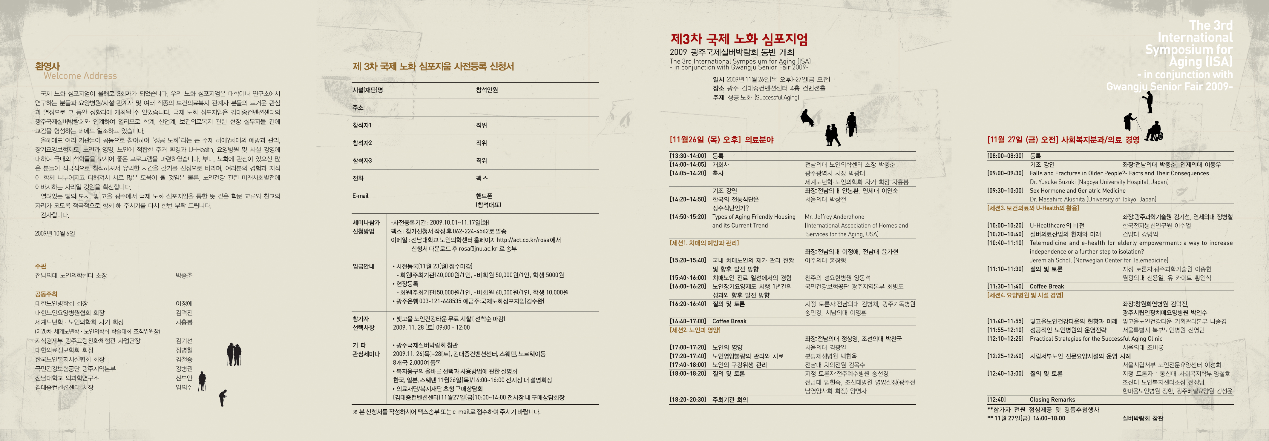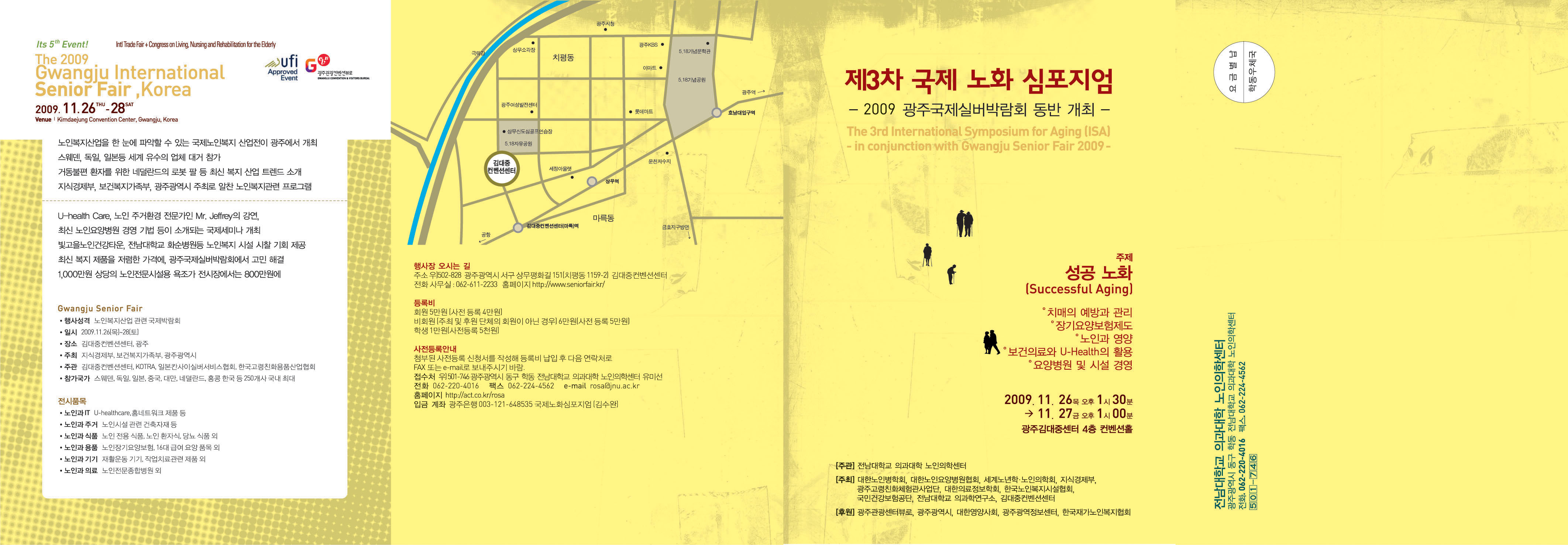 전남대학교의과대학노인의학센터에서 2009 광주국제실버박람회 기간 동안에 성공노화를 주제로 “제3회 국제노화심포지엄”을 개최할 계획입니다. 이번 심포지엄에는 미국, 노르웨이, 일본 등의 노인의료분야․요양분야 전문가로부터 성공노화를 위한 영양관리, 치매예방, 보건의료, U-healthcare, 주거환경과 관련된 최신 정보를 듣는 뜻 깊은 자리가 될 것입니다.