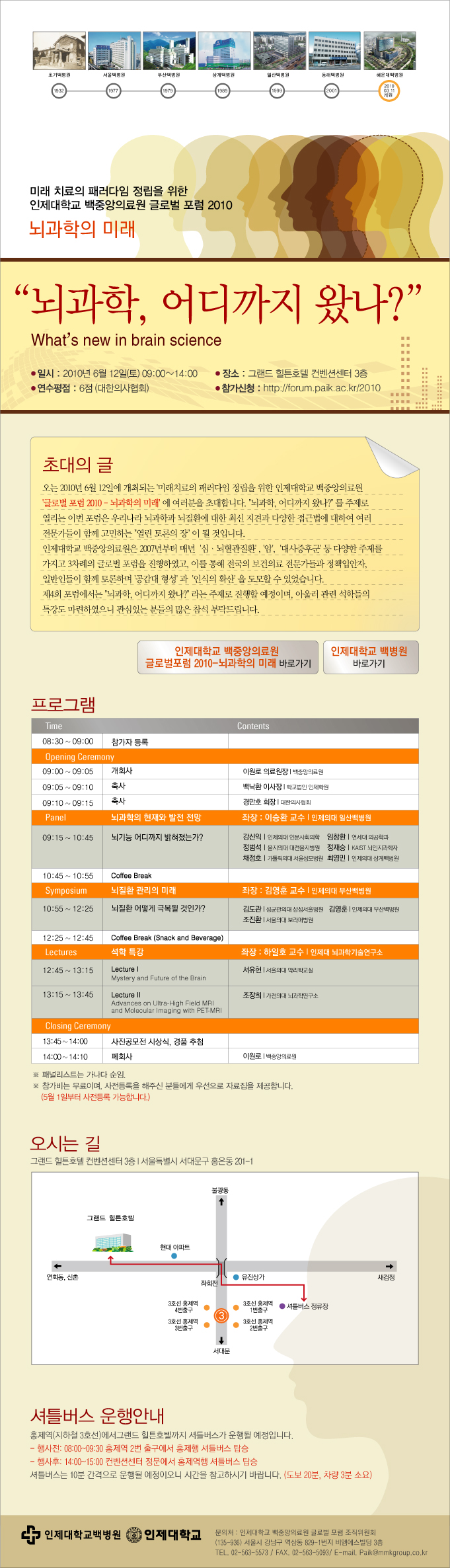 오는 2010년 6월 12일에 개최되는 "미래치료의 패러다임 정립을 위한 인제대학교 백중앙의료원 글로벌포럼 2010 - 뇌과학의 미래"에 여러분을 초대합니다. "뇌과학, 어디까지 왔나?"를 주제로 열리는 이번 포럼은 우리나라 뇌과학과 뇌질환에 대한 최신 지견과 다양한 접근법에 대하여 여러 전문가들이 함께 고민하는 "열띤 토론의 장"이 될 것입니다.