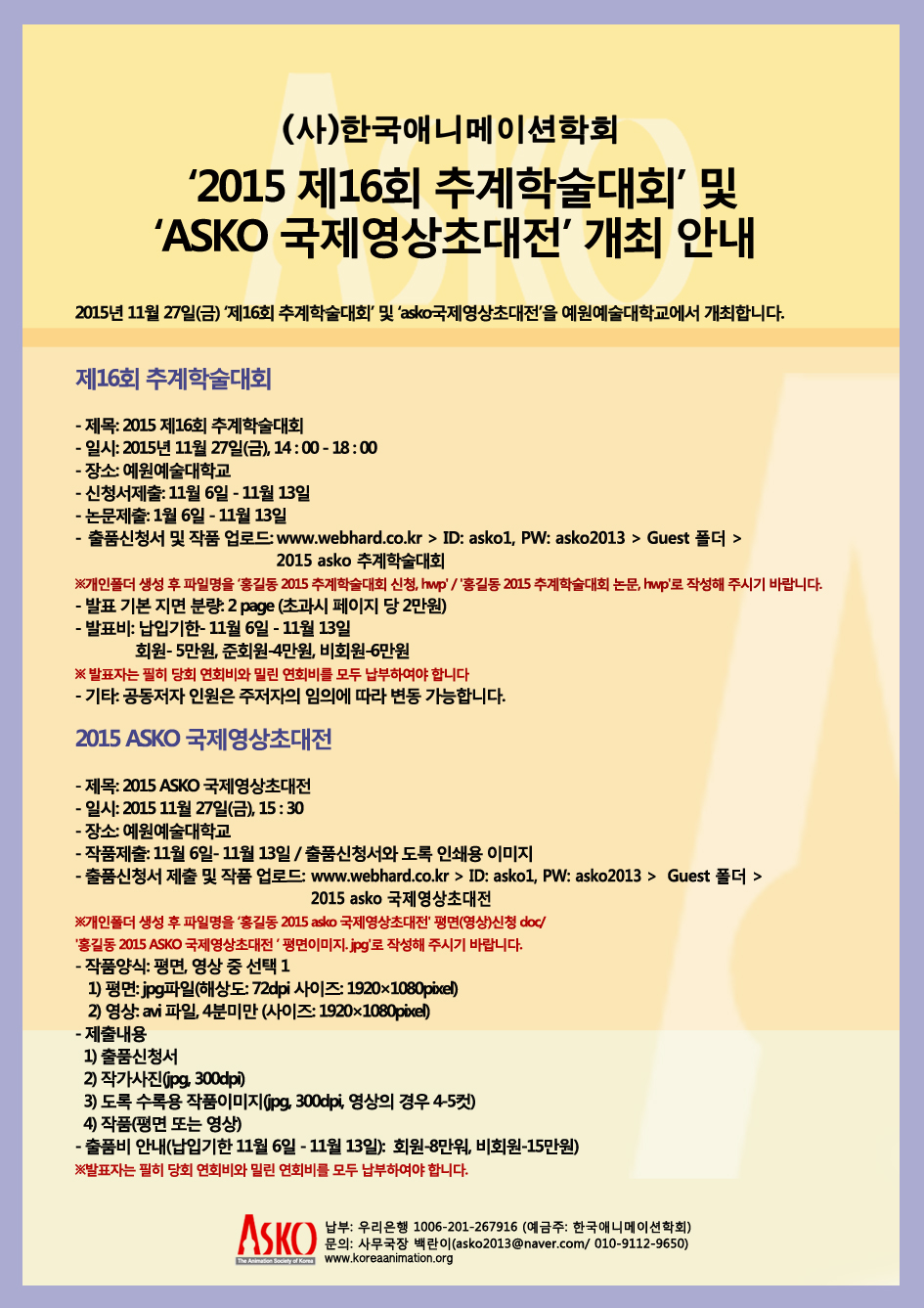 '2015 제16회 추계학술대회’ 및 ‘ASKO 국제영상초대전' 개최 2차 안내