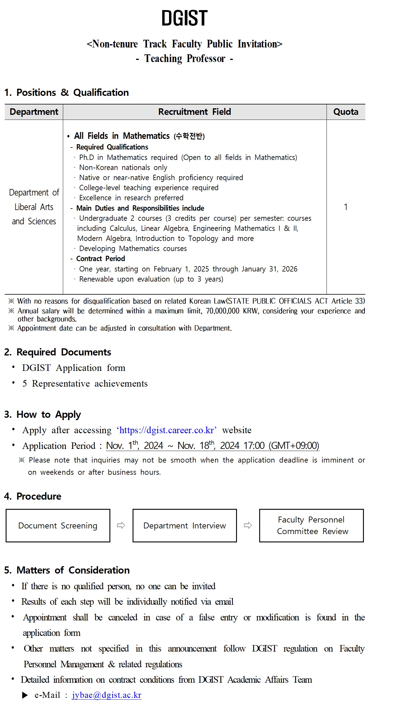 DGIST에서 외국인 강의 교수를 모시고자 합니다.