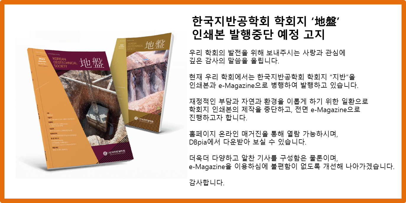 현재 우리 학회에서는 한국지반공학회 학회지 “지반”을 인쇄본과 e-Magazine으로 병행하여 발행하고 있습니다.