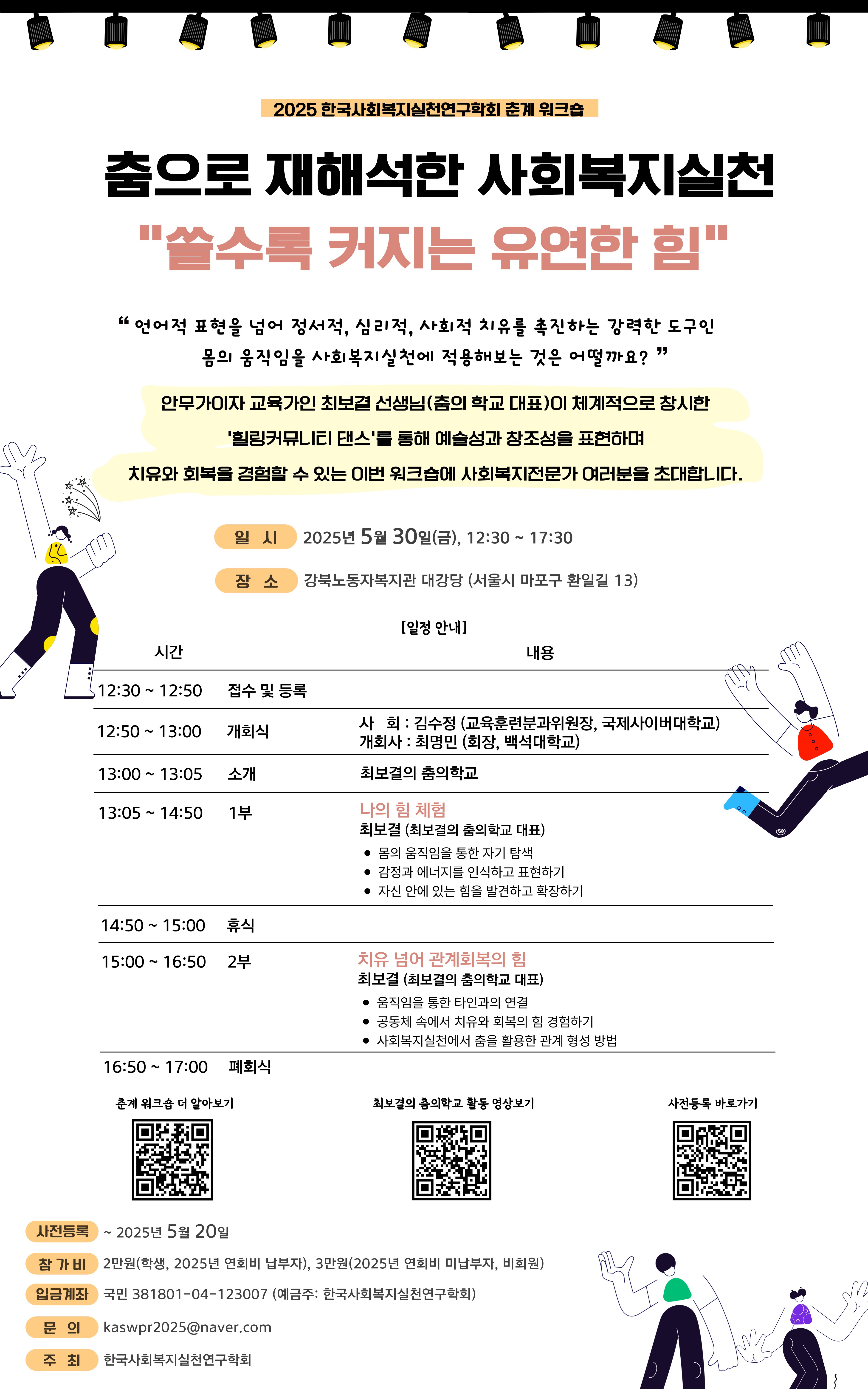 본 학회에서는 5월 30일 춤으로 재해석한 사회복지실천 “쓸수록 커지는 유연한 힘” 이라는 주제로 춘계워크숍을 개최 예정입니다.