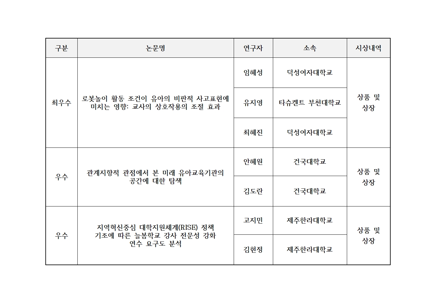 우수논문으로 선정된 연구자들께 축하의 마음을 전하며, 학회에 보내주시는 회원 여러분들의 많은 관심과 참여에 깊은 감사를 드립니다.