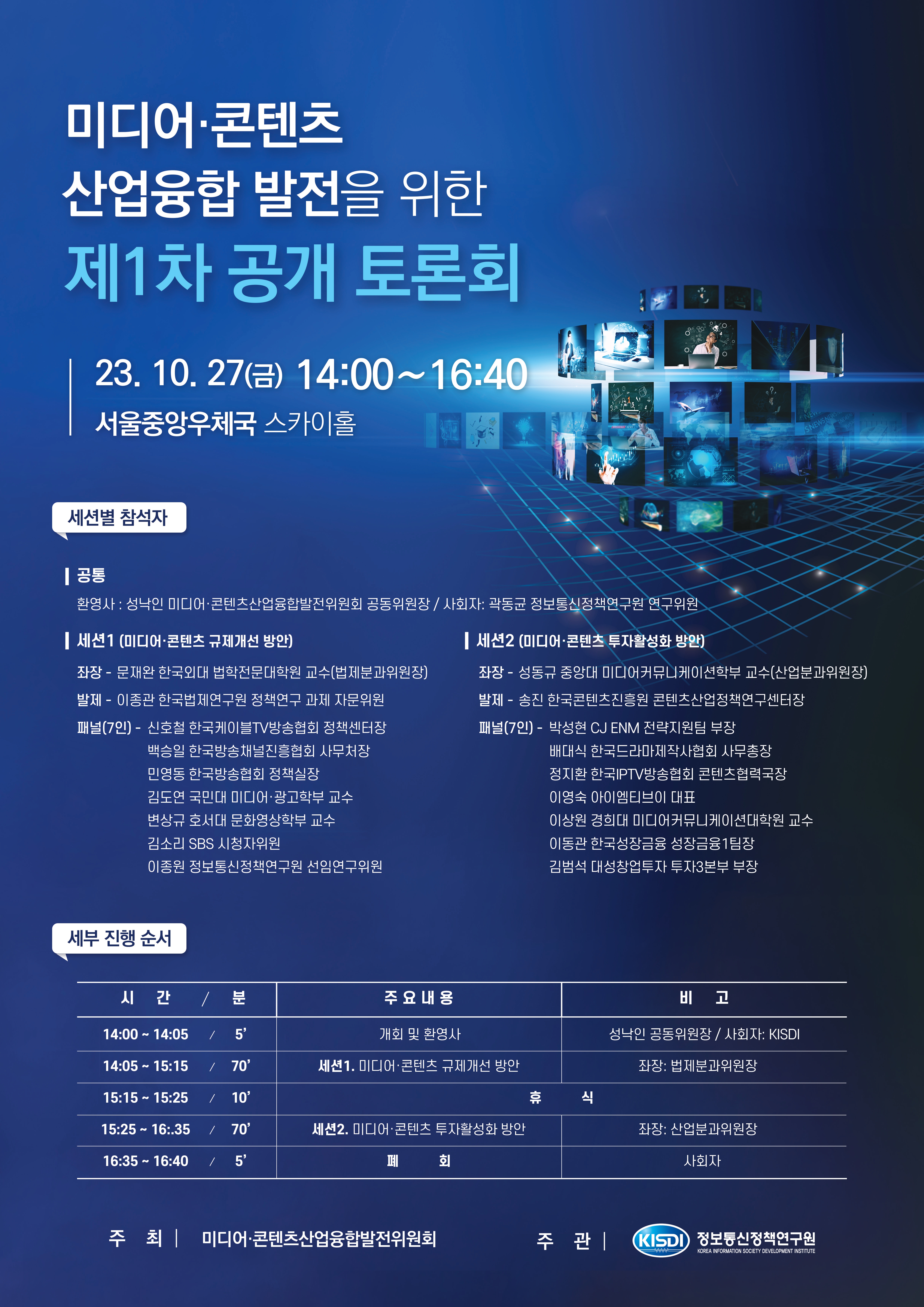 KISDI 연구원이 주관하고, 국무조정실 산하의 '미디어/콘텐츠산업융합발전위원회'가 주최하는 공개토론회를 안내합니다.