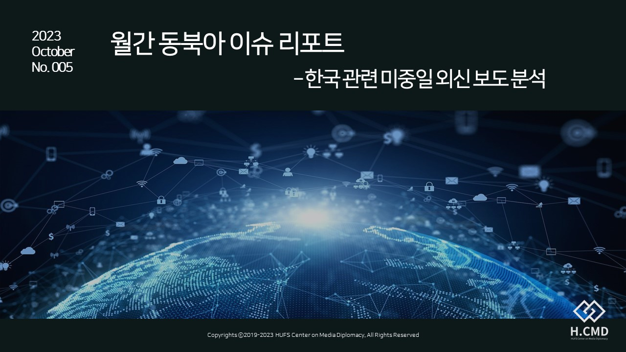 2. 한국외대 미디어외교센터(H.CMD)에서 <동북아 이슈 리포트> 5호(10월호)를 발간하였습니다. 이에 다음과 같이 안내해 드리니, 회원 여러분의 많은 관심 바랍니다.
