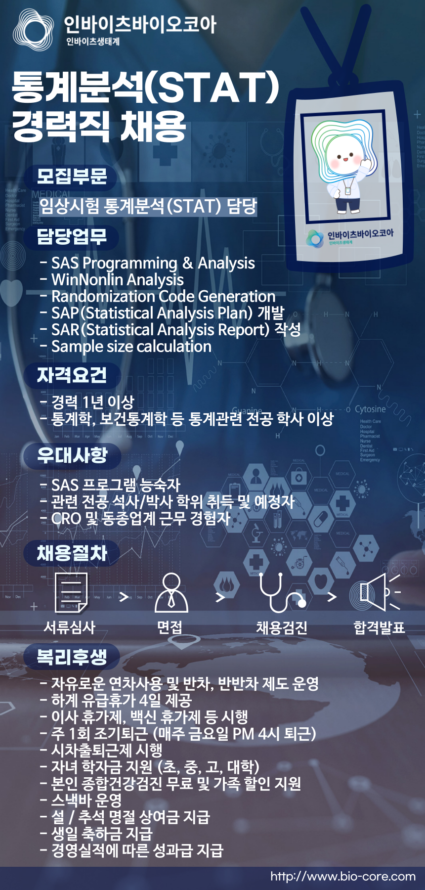 인바이츠바이오코아(주)에서 아래와 같이 임상시험 통계분석(STAT) 경력직을 모집하고 있습니다.