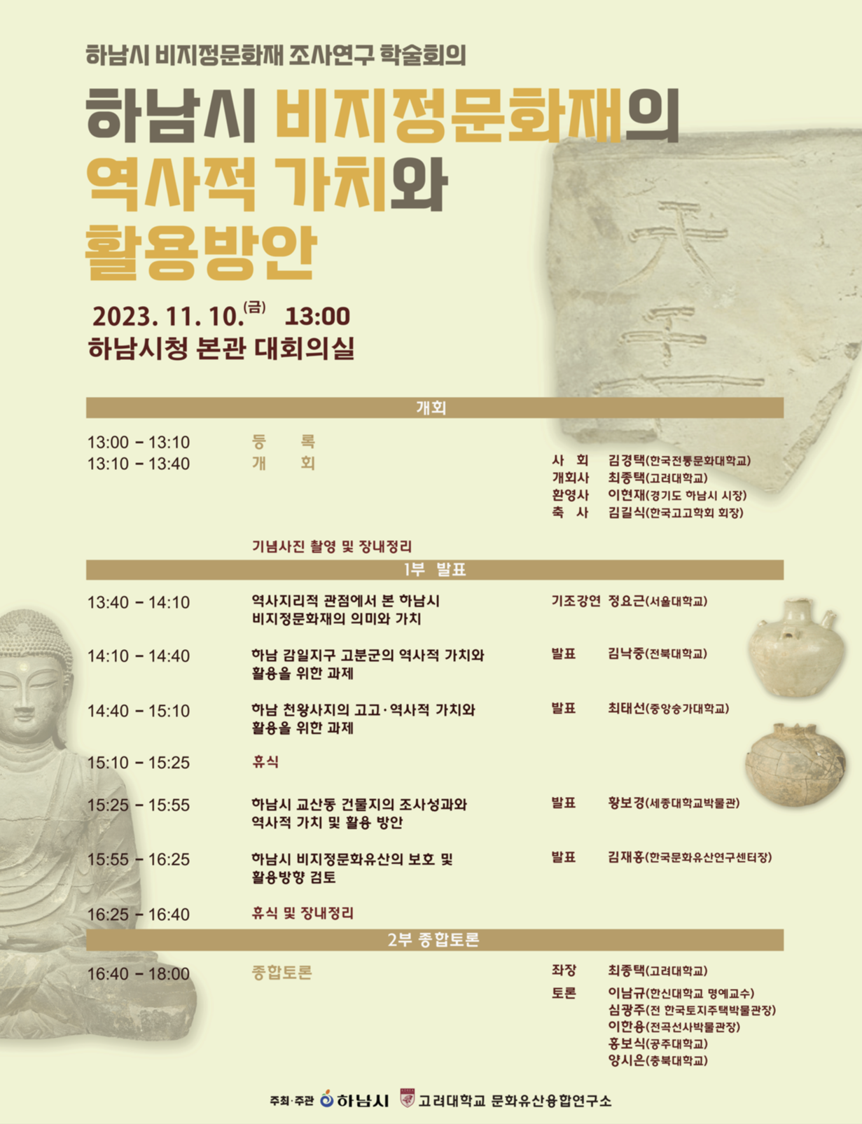 하남시와 고려대학교 문화유산융합연구소에서 “하남시 비지정문화재의 역사적 가치와 활용방안”을 주제로한 학술회의를 개최합니다.