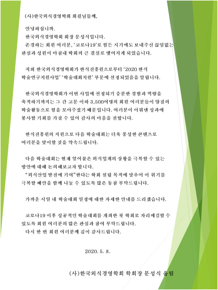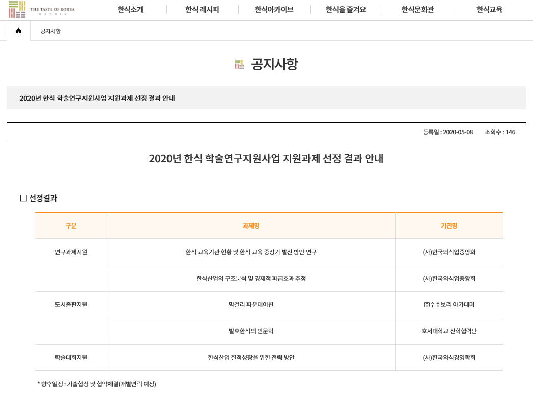 한식진흥원 2020년 한식 학술연구지원사업 선정