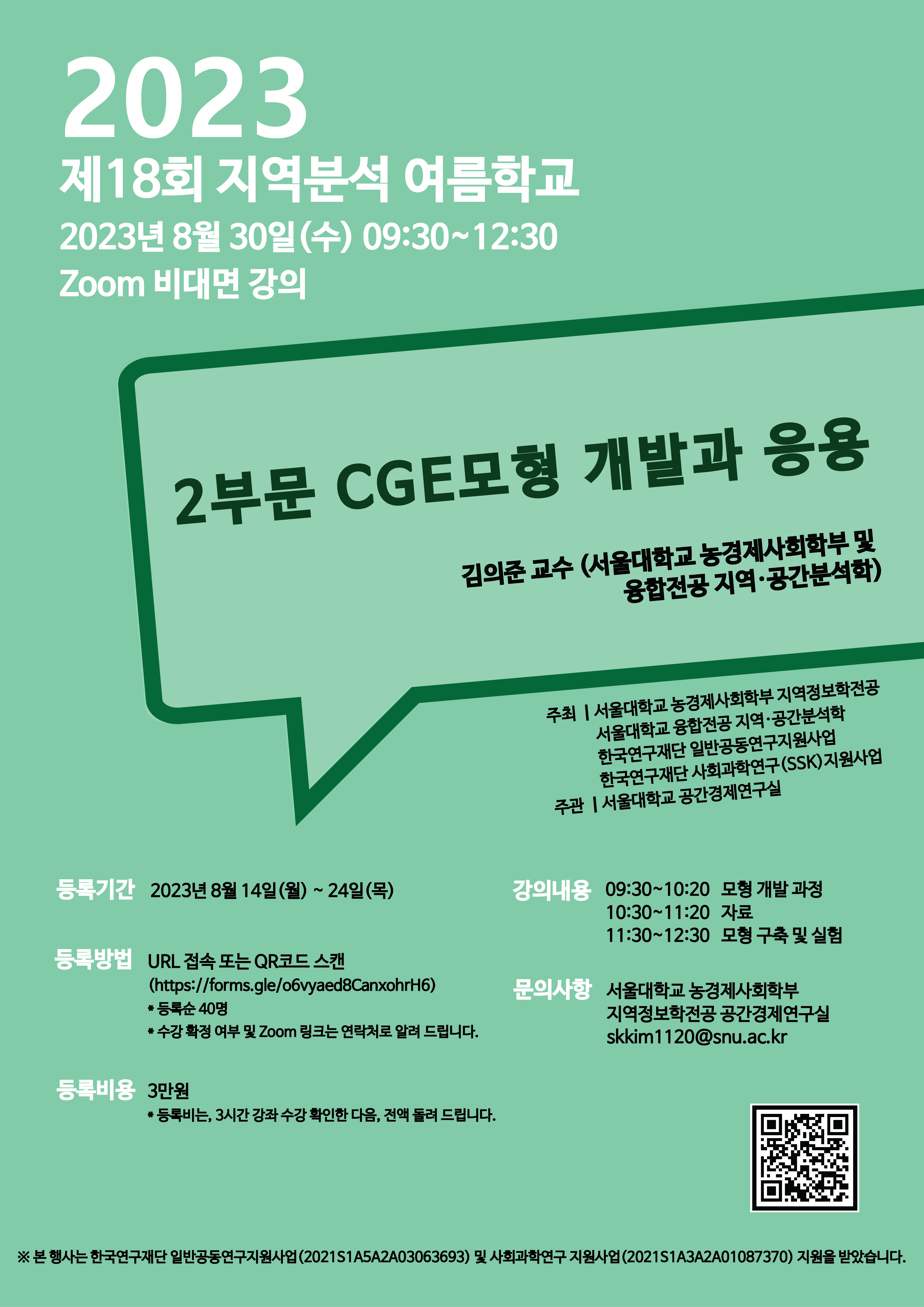 이번 지역분석 여름학교에서는 Computable General Equilibrium (CGE) 모형의 가장 기본적인 구조를 배우고, (지역) 정책에 어떻게 활용될 수 있는지를 정리해 보고자 합니다. 가능하면, 모형 개발에 필요한 자료 구축부터 모형을 응용할 수 있는 GAMS coding까지 다룰 계획입니다.