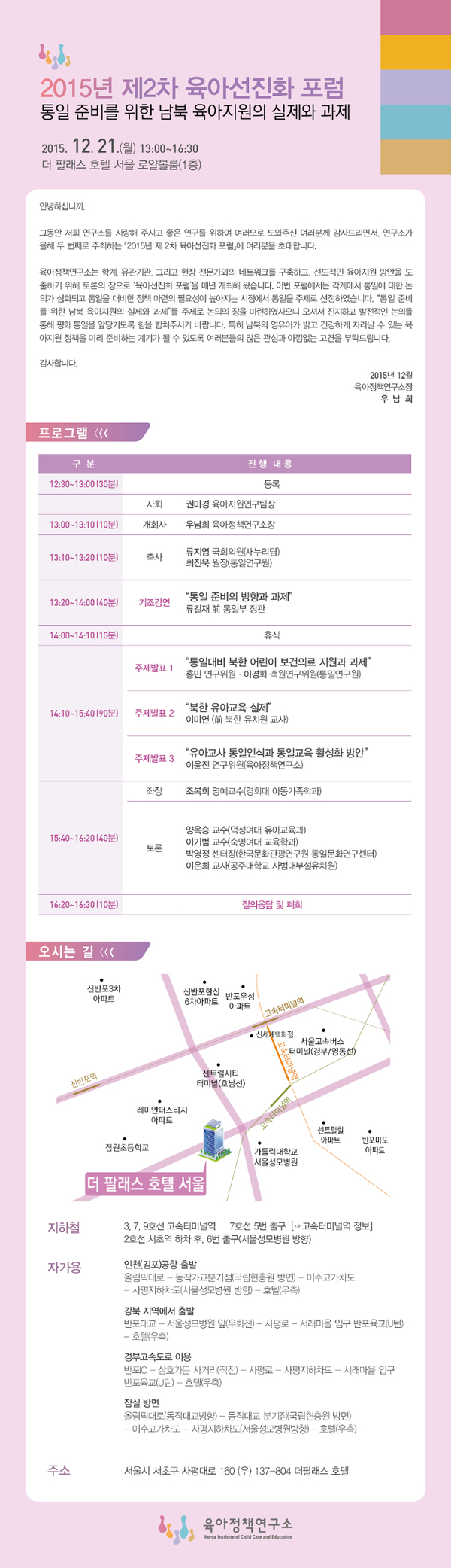 국무총리 산하 육아정책연구소에서 제2차 육아선진화 포럼을 개최합니다. 참여를 희망하시는 분은 페이지 하단에 첨부된 참여신청서 메일로 보내주시기 바랍니다. 신청서 제출: yys8291@kicce.re.kr *문의처: 육아정책연구소 연구기획팀 02-398-7787 (yys8291@kicce.re.kr)