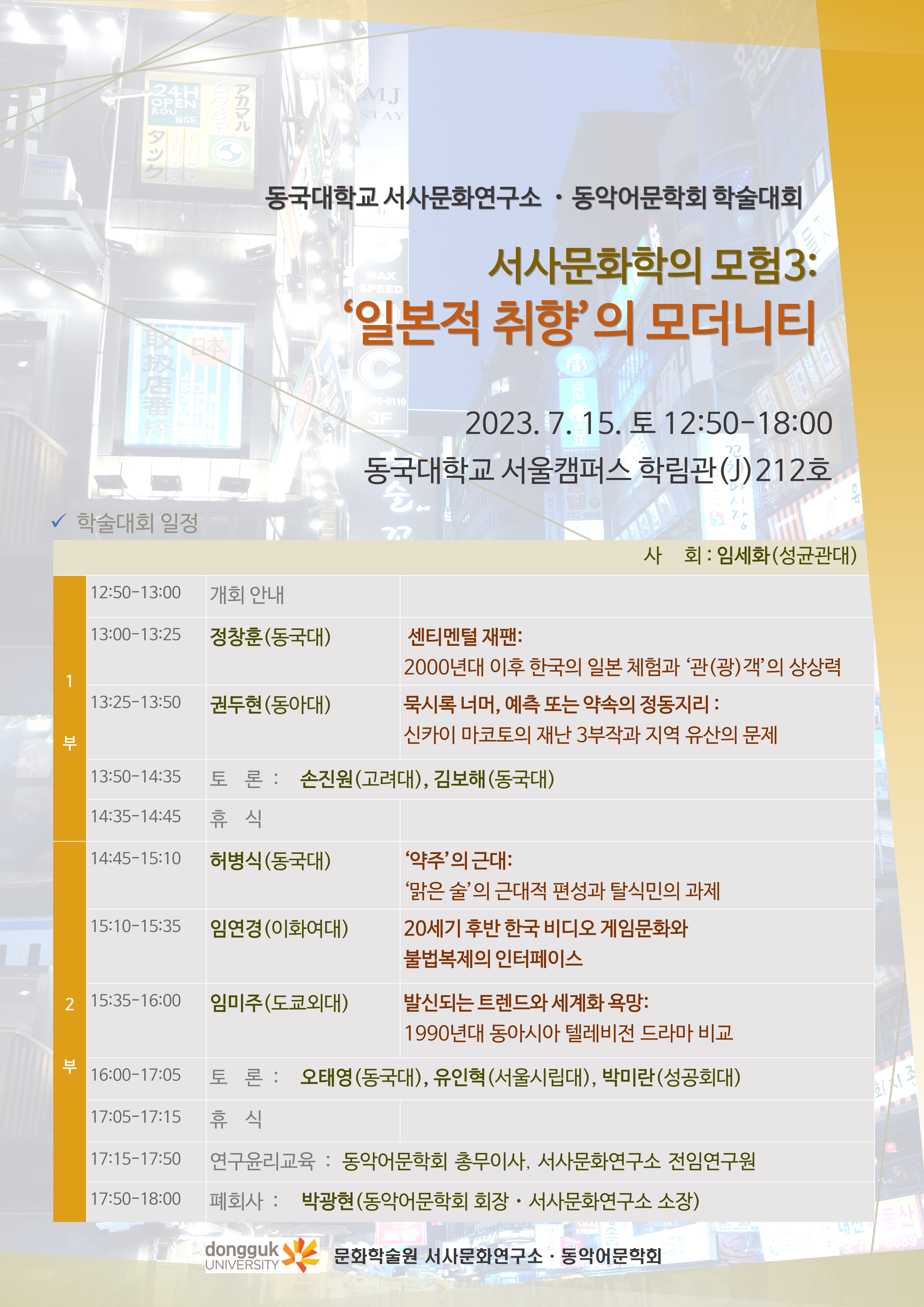 | 1부 | 13:00-13:25 | 정창훈(동국대) | 센티멘털 재팬: 2000년대 이후 한국의 일본 체험과 ‘관(광)객’의 상상력 |