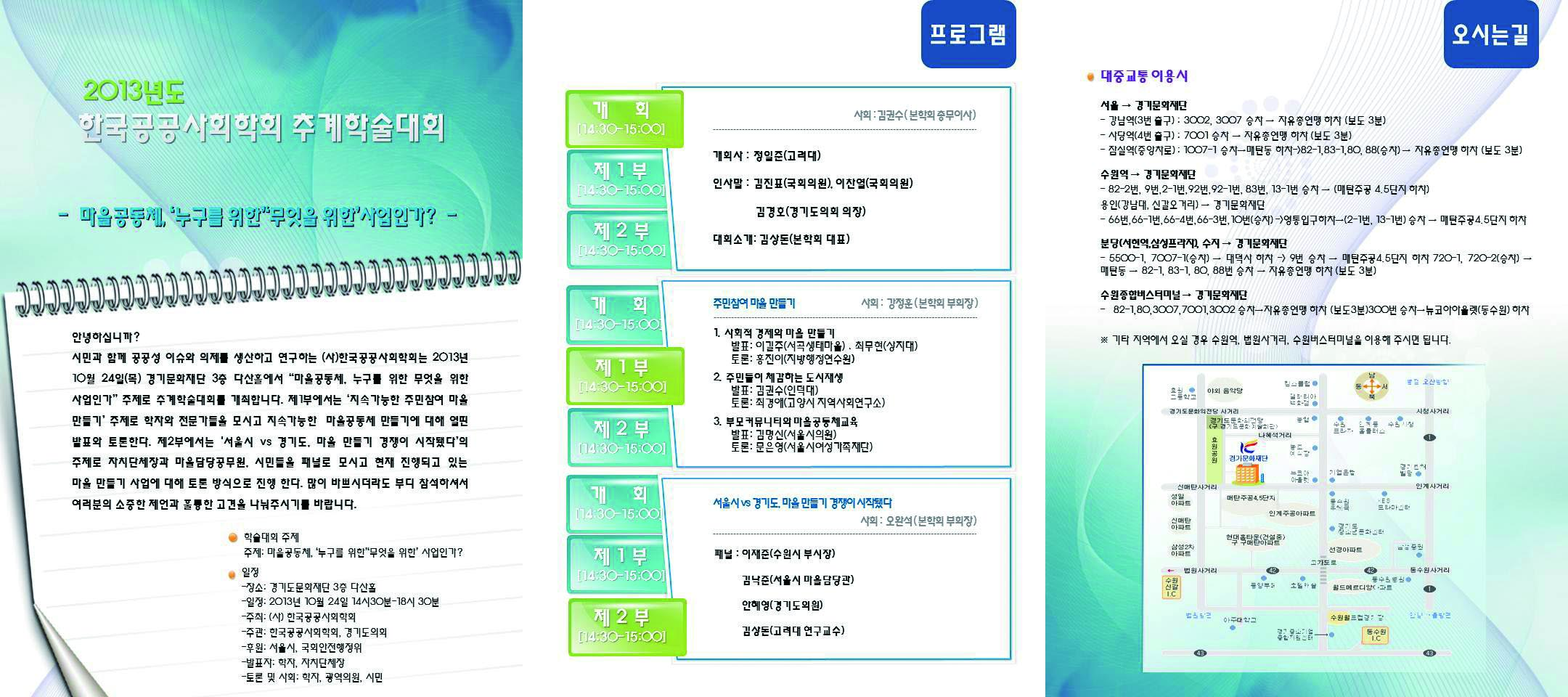 시민과 함께 공공성 이슈와 의제를 생산하고 연구하는 (사)한국공공사회학회는 2013년 10월 24일(목) 경기문화재단 3층 다산홀에서 “마을공동체, 누구를 위한 무엇을 위한 사업인가” 주제로 추계학술대회를 개최합니다. 제1부에서는 ‘지속가능한 주민참여 마을 만들기’ 주제로 학자와 전문가들을 모시고 지속가능한 마을공동체 만들기에 대해 열띤 발표와 토론한다. 제2부에서는 '서울시 vs 경기도, 마을 만들기 경쟁이 시작됐다’의 주제로 자치단체장과 마을담당공무원, 시민들을 패널로 모시고 현재 진행되고 있는 마을 만들기 사업에 대해 토론 방식으로 진행한다. 많이 바쁘시더라도 부디 참석하셔서 여러분의 소중한 제언과 훌륭한 고견을 나눠주시기를 바랍니다.