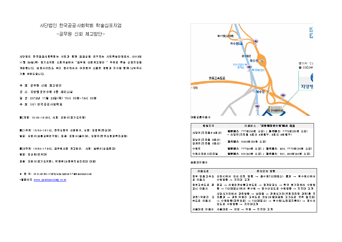 사단법인 한국공공사회학회는 시민과 함께 공공성을 연구하는 시민학술단체로서, 2012년 11월 29일(목) 경기도의회 소회의실에서 “공무원 신뢰제고방안 ” 주제로 학술 심포지엄을 개최합니다. 바쁘시더라도 부디 참석하셔서 여러분의 소중한 경험과 지식을 함께 나눠주시기를 부탁드립니다.
