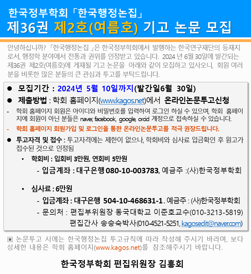 한국행정논집 36권 2호 논문기고 안내--기간연장