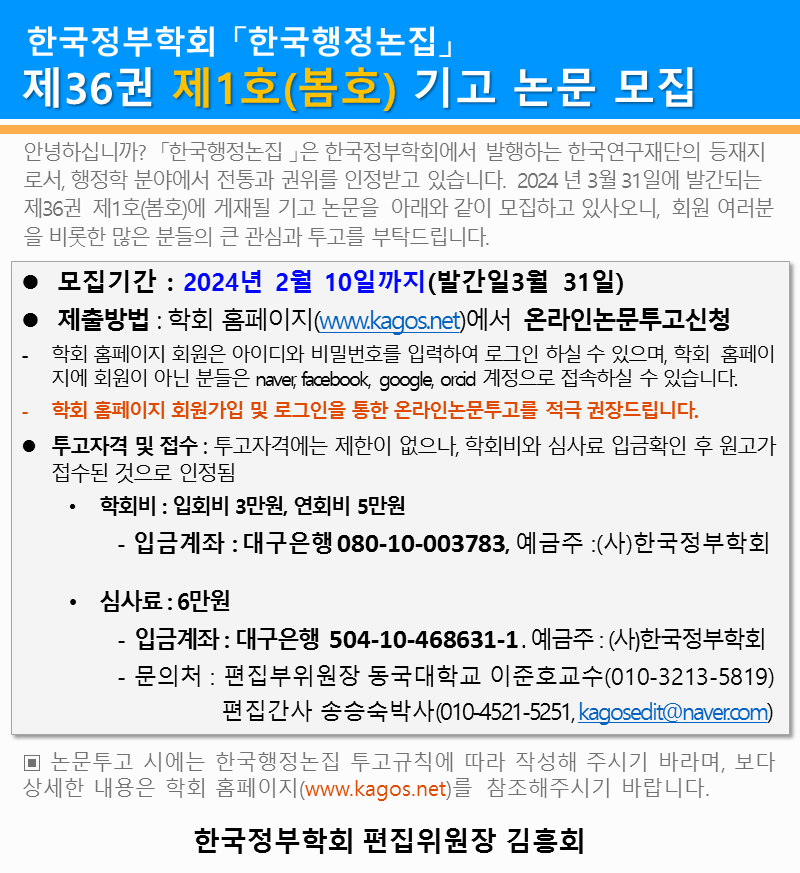 한국행정논집 제36권 1호 논문기고 안내=기간연장