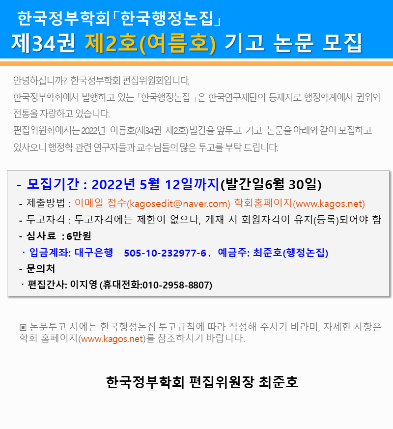 한국행정논집 34권 2호 논문기고 안내-기간연장-