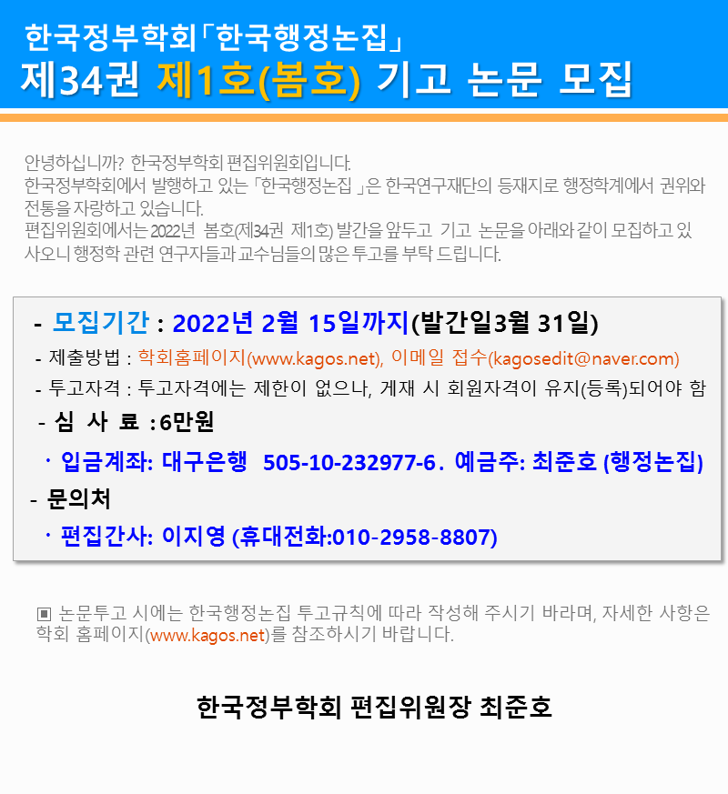한국행정논집 34권 1호 논문기고 안내-기간연장-