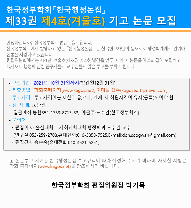 「한국행정논집」 2021년도 한국연구재단 학술지평가 결과 안내 "등재유지"