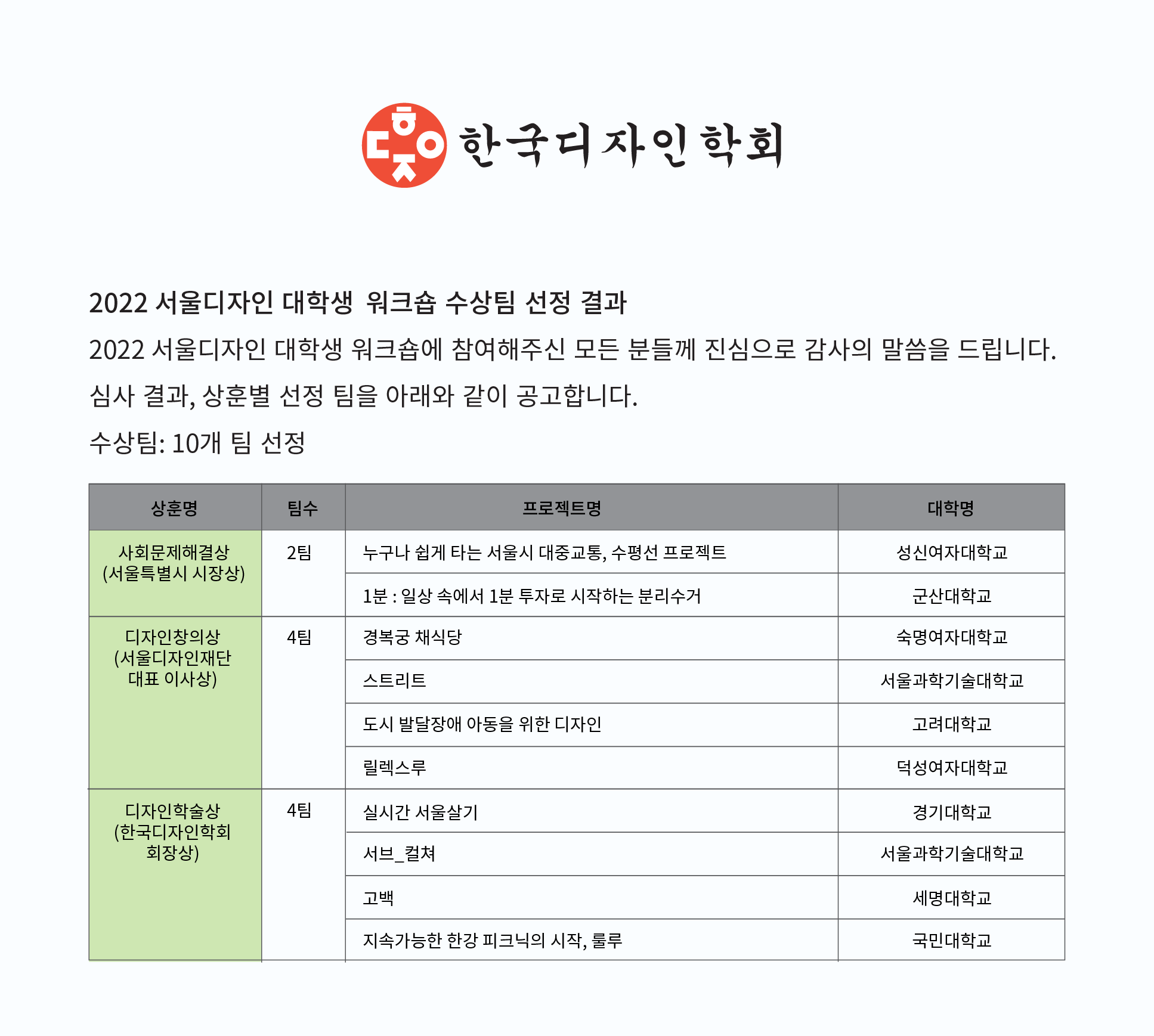 2022 서울디자인 대학생 워크숍 수상팀 공지
