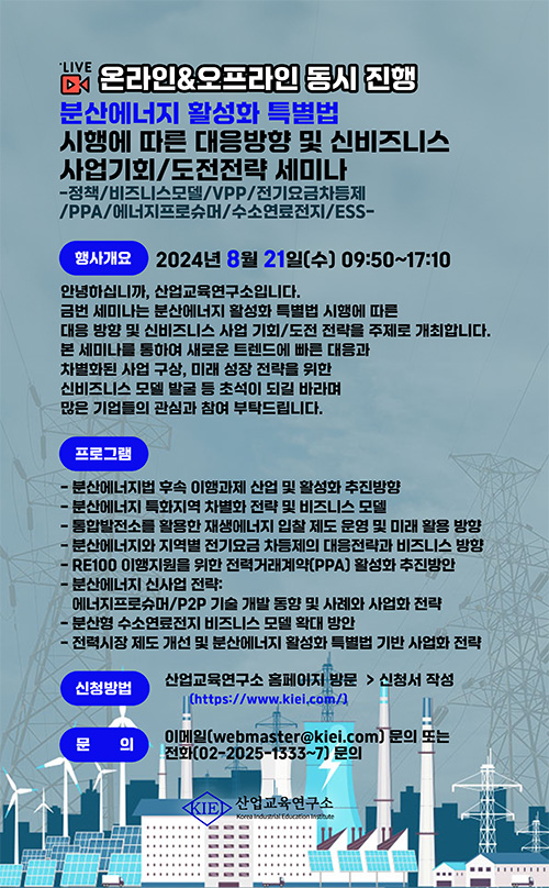 금번 세미나는 분산에너지 활성화 특별법 시행에 따른 대응 방향 및 신비즈니스 사업 기회/도전 전략을 주제로 개최합니다.