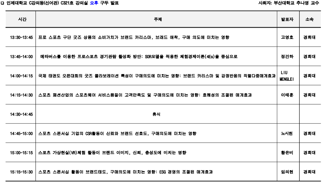 제105회 전국체육대회 기념 제62회 한국체육학회 학술대회 분과 세션 발표 순서 안내