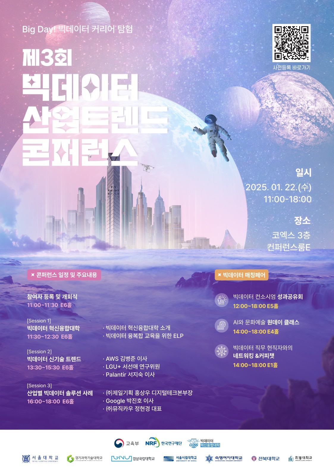 서울대학교 빅데이터 혁신융합대학는 산업계 수요를 반영한 빅데이터 교육과 기술의 연계를 위해 빅테크 기업의 신기술 트렌드 및 솔루션 사례 특강과 함께 컨소시엄 내 성과를 공유 및 확산하는 행사로 "제3회 빅데이터 산업트렌드 콘퍼런스"를 다음과 같이 개최합니다. 빅데이터의 이해와 활용에 관심 많은 구성원들께서는 이번 행사에 많은 참여 바랍니다.