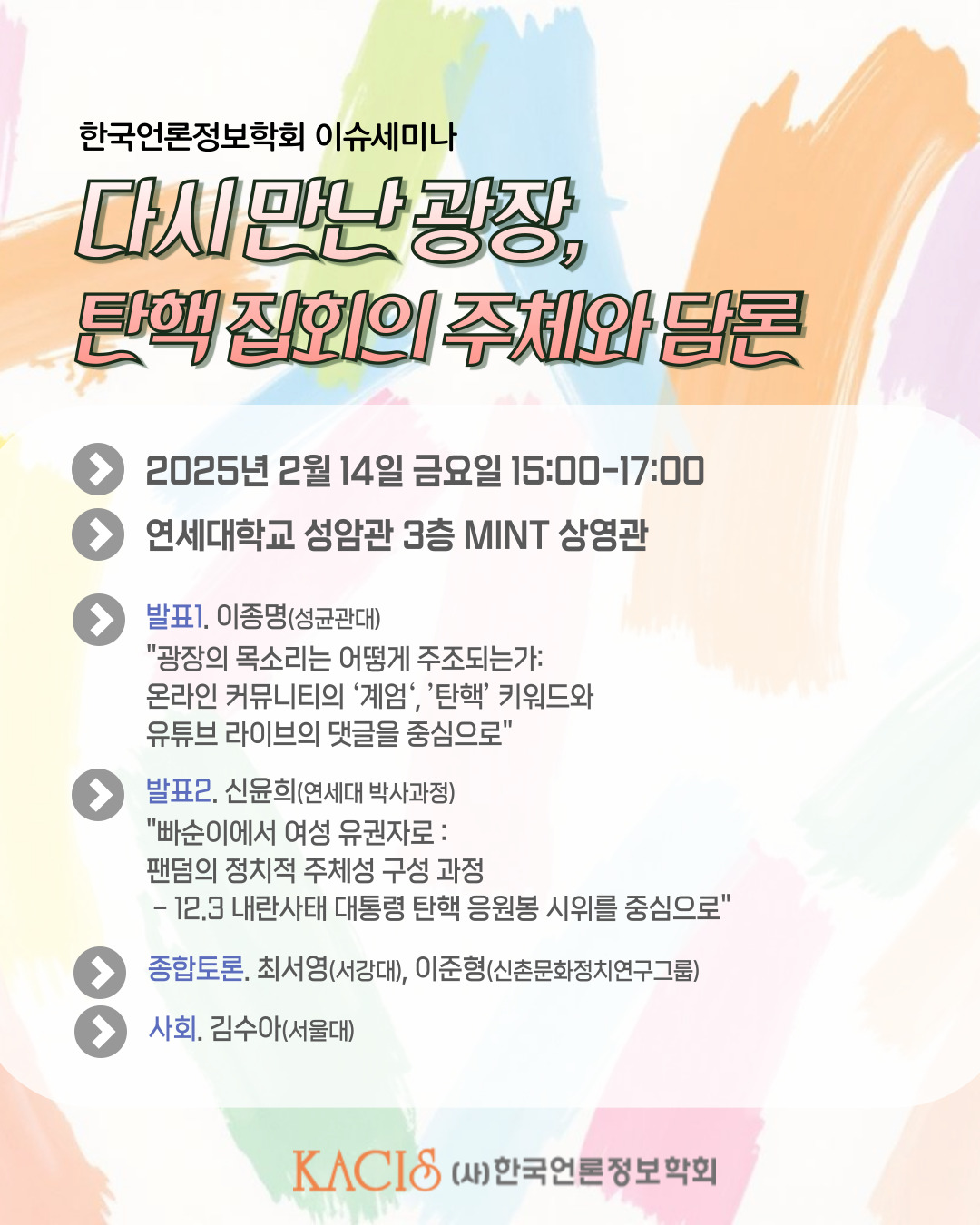 2. 한국언론정보학회는 오는 2월 14일(금요일) 이슈세미나 "다시 만난 광장, 탄핵 집회의 주체와 담론"을 개최합니다. 세미나와 관련한 내용을 다음과 같이 공지합니다. 회원 여러분의 많은 관심과 참여를 부탁드립니다.