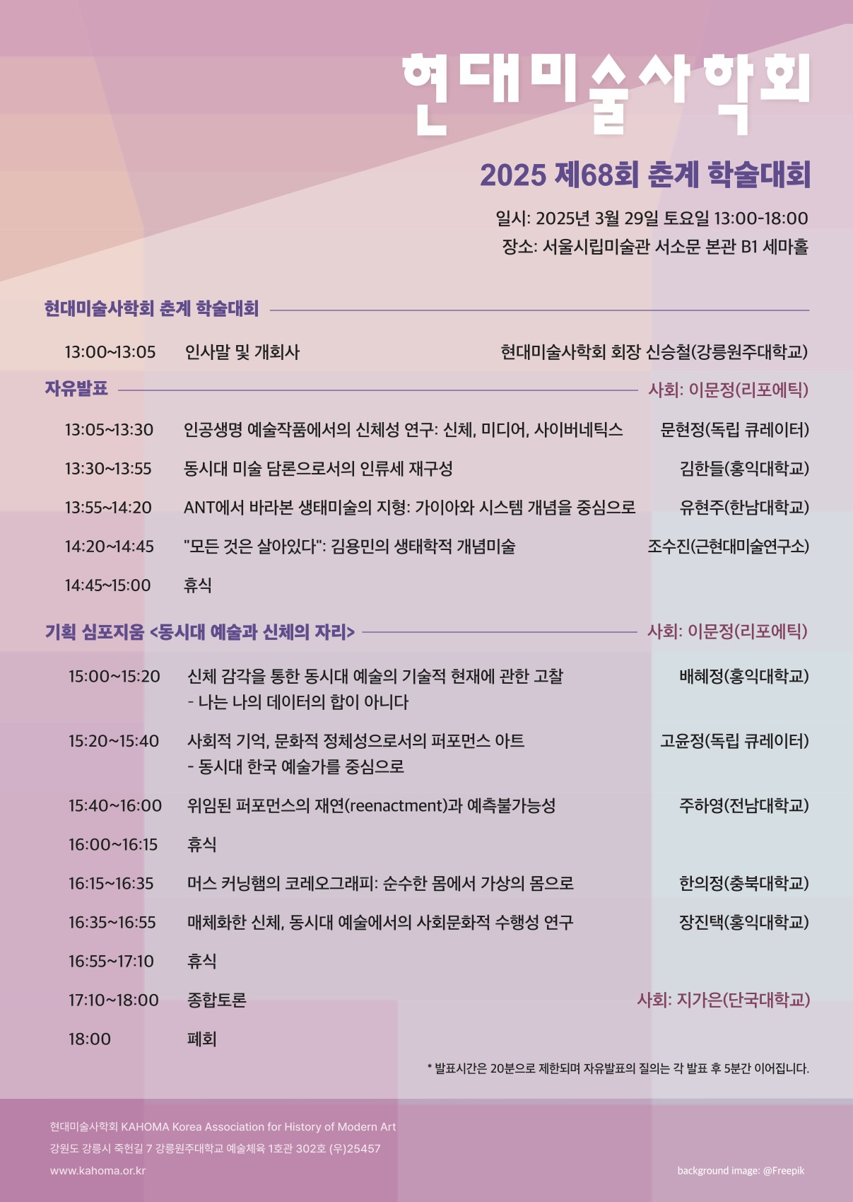 현대미술사학회에서 3월 29일(토) 제68회 춘계학술대회를 아래와 같이 개최합니다.