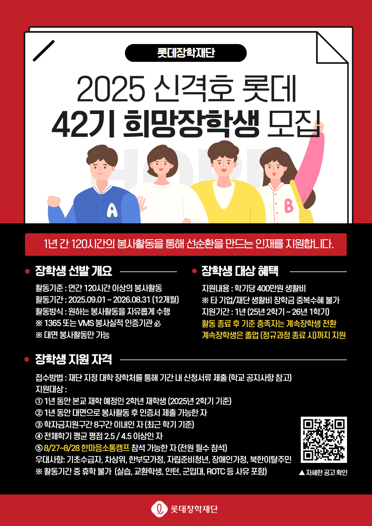 [2025학년도 2학기 롯데장학재단 42기 희망 장학생] 선발 모집 안내드립니다.