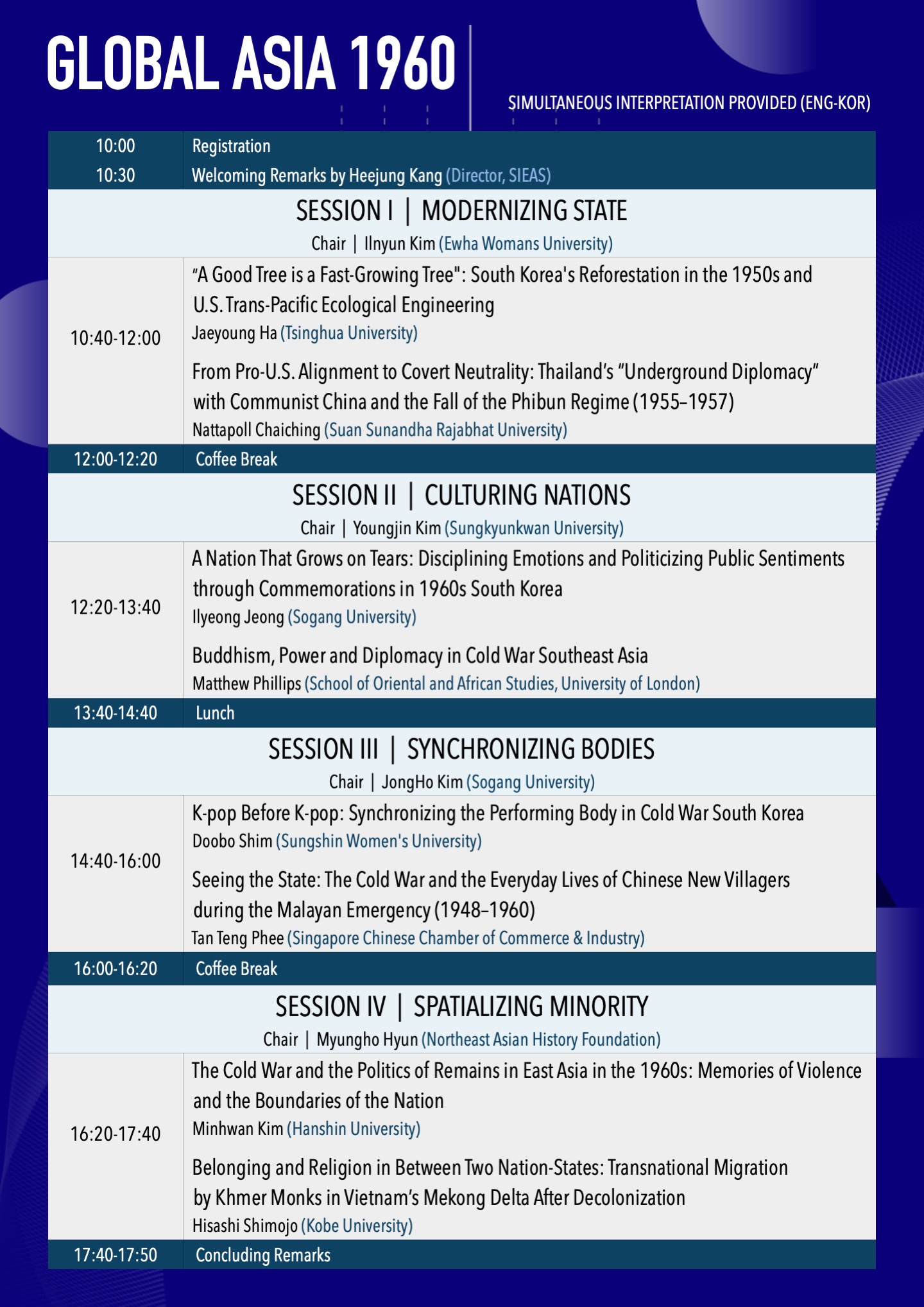 동아연구소는 다년간 급변하는 국제 정세 안에서 아시아의 정치적, 역사적, 경제적, 문화적 역할에 대한 다양한 연구 성과를 거두어 왔습니다. 이번 국제학술대회에서는 냉전 기간 아시아인들의 삶의 경험에 대한 공통의 서사를 찾아내고, 이를 바탕으로 시간과 공간이 교차하는 1960년대 아시아의 거대 서사를 구성하고자 합니다.