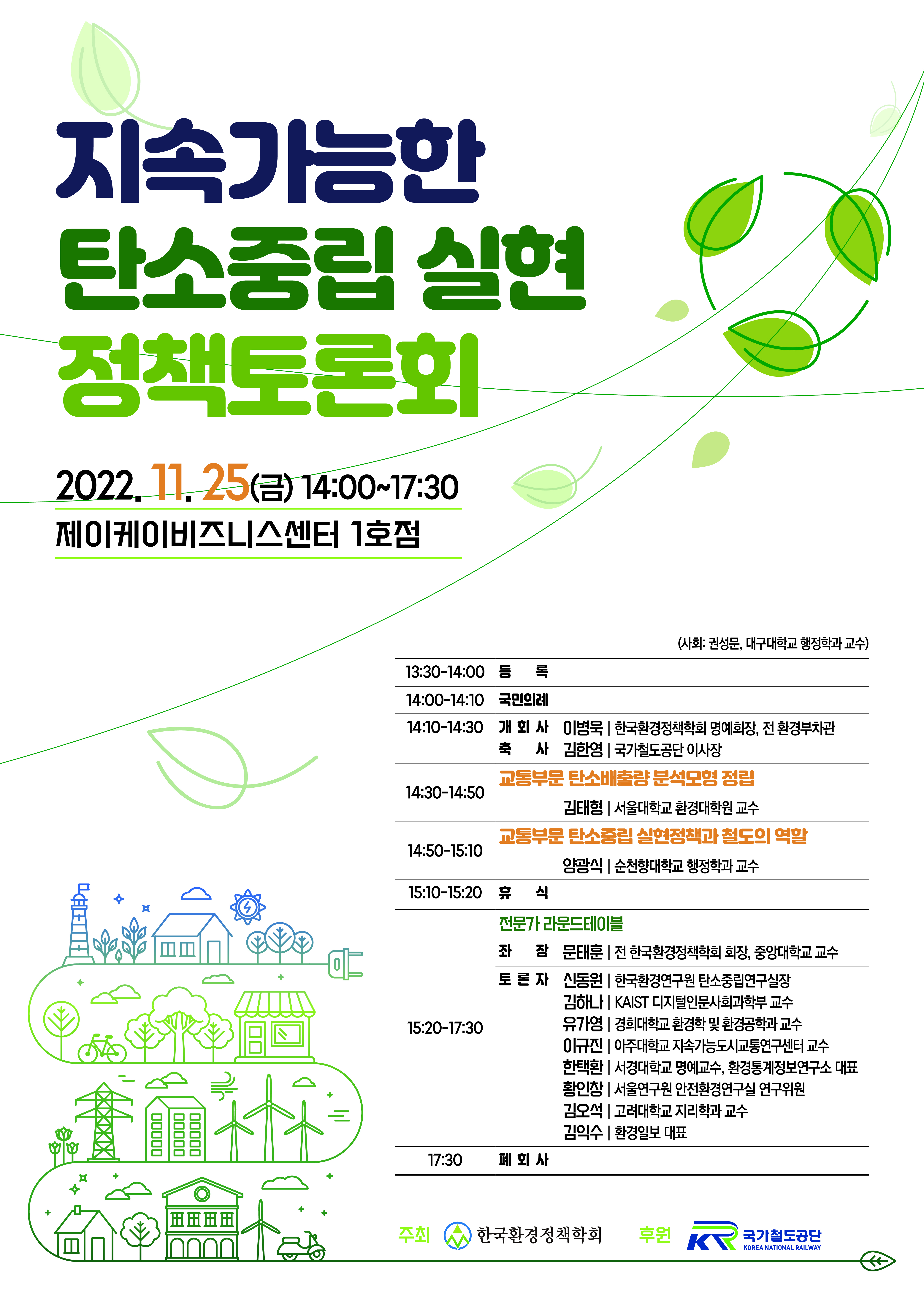 한국환경정책학회는 11.25.(금) 아래와 같이 '지속가능한 탄소중립 실현' 을 주제로 정책토론회를 개최합니다.