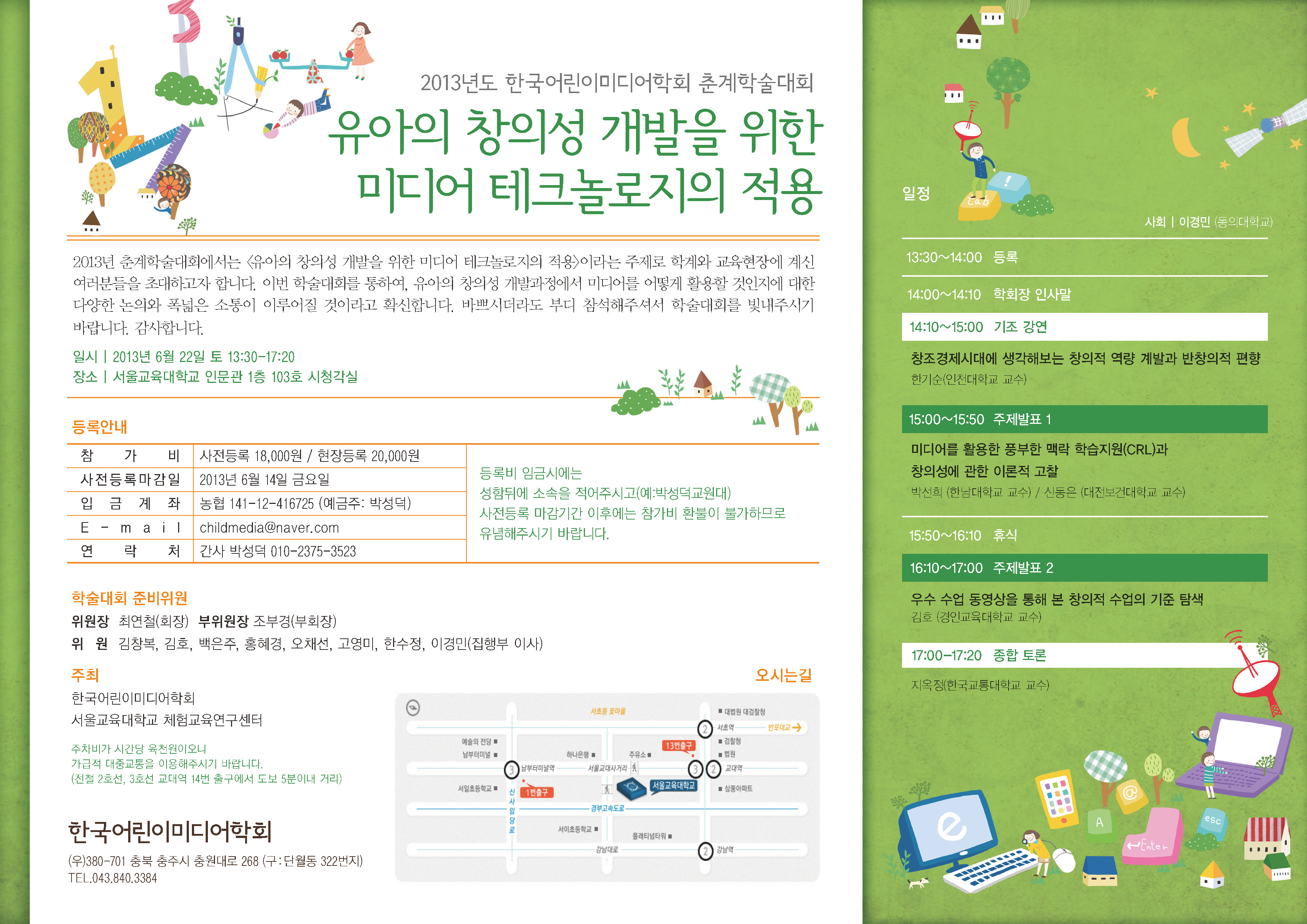 2013년 한국어린이미디어학회 춘계학술대회에서는 <유아의 창의성 개발을 위한 미디어 테크놀로지의 적용>이라는 주제로 학계와 교육현장에 계신 여러분들을 초대하고자 합니다. 이번 학술대회를 통하여, 유아의 창의성 개발과정에서 미디어를 어떻게 활용할 것인지에 대한 다양한 논의와 폭넓은 소통이 이루어질 것이라고 확신합니다. 바쁘시더라도 부디 참석해주셔서 학술대회를 빛내주시기 바랍니다. 감사합니다.