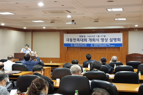 년 8월 14일 러시아연구소는 한국외대 디지털인문학국학연구소와 공동으로 ‘극동민족대회’개회식 동영상 관련 설명회를 한국외대 서울캠퍼스 교수회관 강연실에서 개최했다. 본 설명회에서 한국외대 사학과 반병률 교수는 지난 7월 러시아 사진영상물 보관소에서 발굴한 자료인 1922년 1월 모스크바에서 개최된 ‘극동민족대회’ 개회식 영상을 공개했다. 이제까지 극동만족대회는 2~3장의 사진으로만 볼 수 있었으나, 새로이 발굴된 영상에서는 대회에 참석한 홍범도, 여운형, 김규식, 현순, 최진동, 김단야 등 한국대표들을 비롯해, 지노비예프, 칼리닌, 부하린, 등 코민테른 지도자들의 생생한 모습이 등장하고 있다. 1920년대 소련에서 개최된 ‘극동민족대회’의 역사적 의미와 한국독립운동사에서의 평가 등을 되짚어 볼 수 있는 뜻 깊은 행사였으며, 본 설명회 준비를 위해 강덕수 러시아연구소장은 위 영상에 등장하는 자막 분석 작업에 참여하였다.