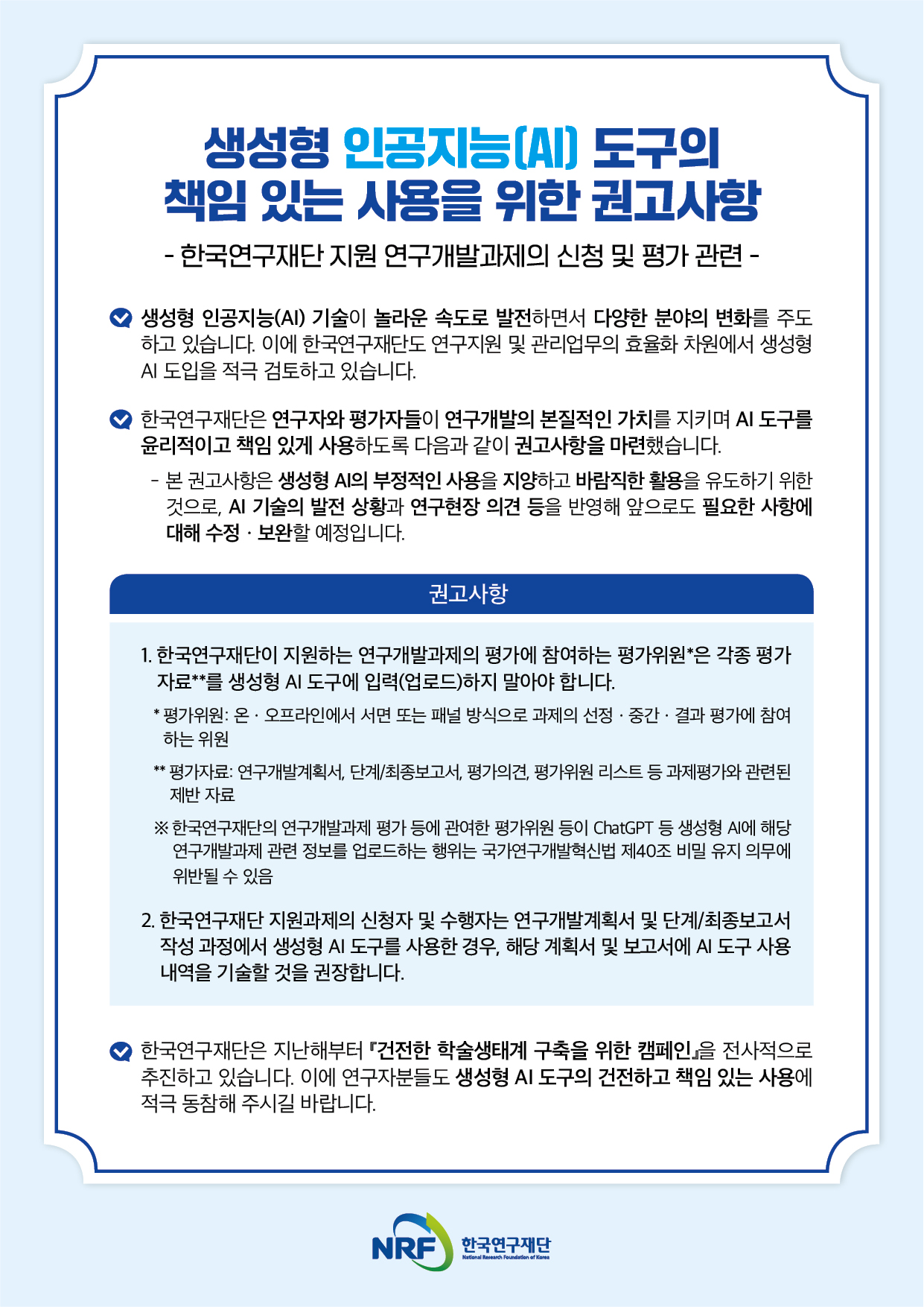 한국연구재단 - 생성형 인공지능(AI) 도구의 책임 있는 사용을 위한 권고사항 안내