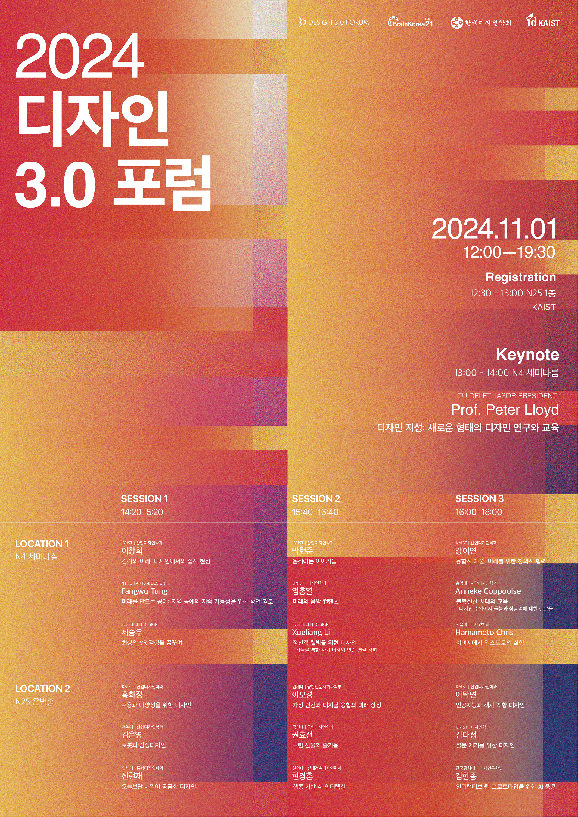 안녕하세요, KAIST 산업디자인학과(ID KAIST)에서 11월 1일 대전에서 열리는 2024 디자인 3.0 포럼에 한국디자인학회 회원 여러분을 초대합니다!