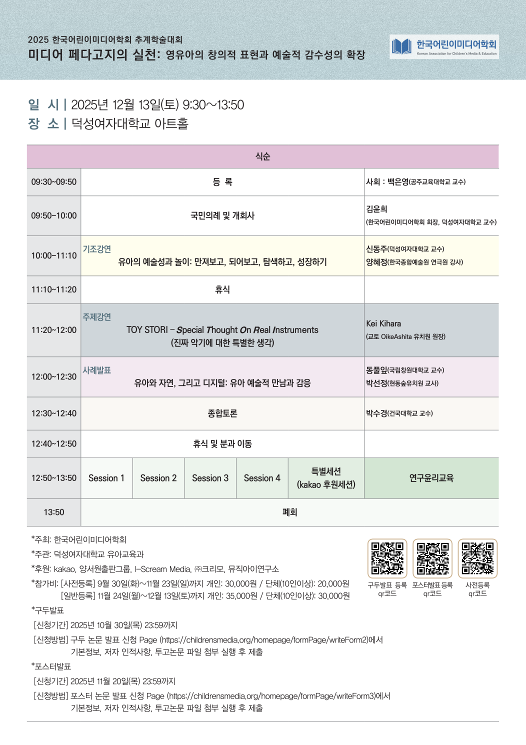 이번 추계학술대회는 ‘미디어 페다고지의 실천: 영유아의 창의적 표현과 예술적 감수성의 확장’이라는 주제로 학계 및 현장 전문가를 모시고 학문적⸱실천적 배움과 공유의 즐거움을 나누는 장을 마련하고자 합니다.